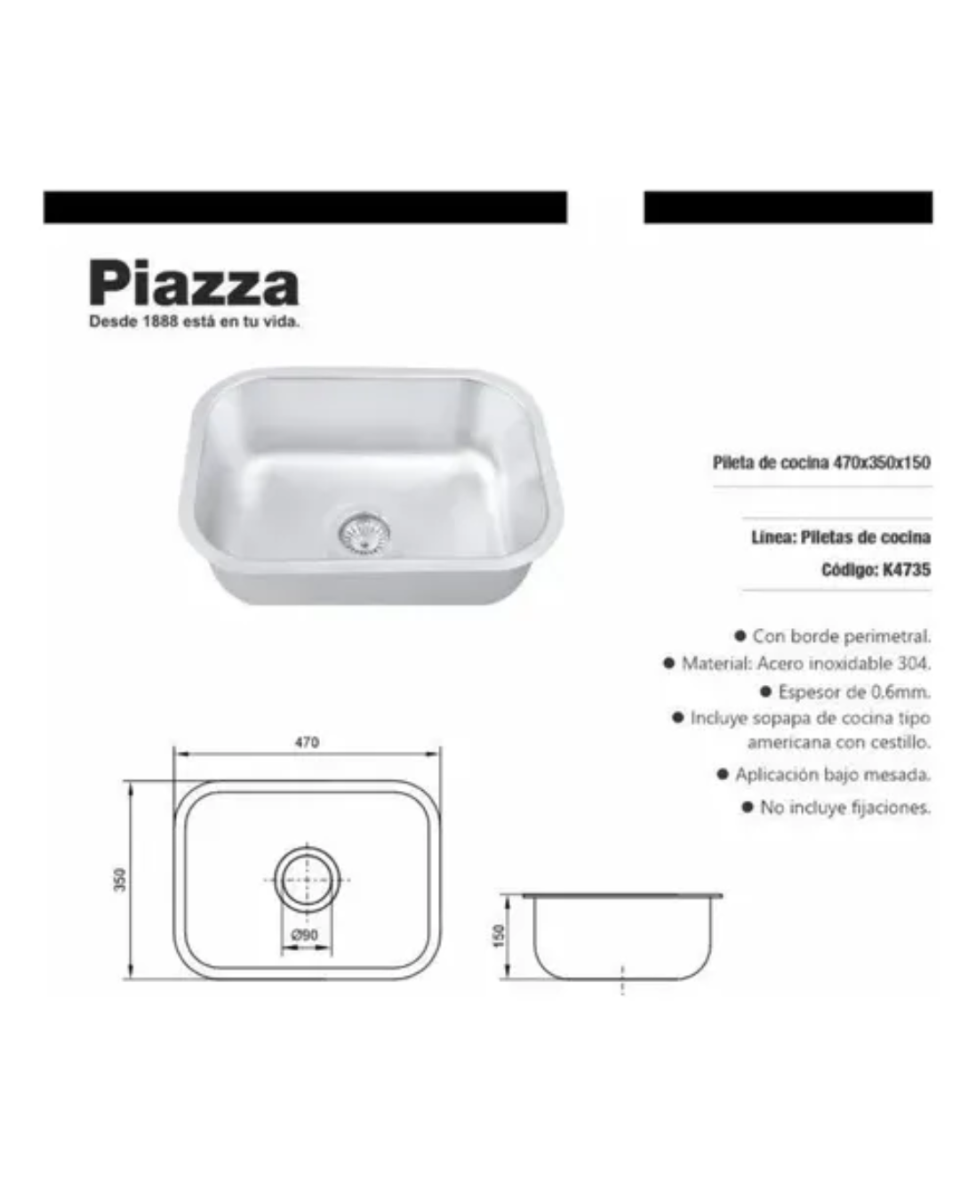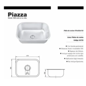 Bacha Cocina Piazza 470x350x150 K4735 Acero Inoxidable