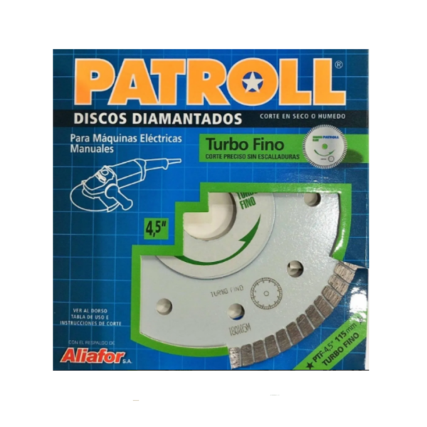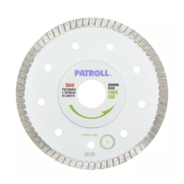 Disco diamantado turbo fino. Diámetro: 115 mm ( 4.5″ ). Buje: 22.2 mm. Espesor: 1.3 mm. Corte Bueno en : Azulejos, Cerámica Blanda, Cerámica Dura y Esmaltada, Porcelanas, Porcelanatos, Silestone, Yeso/ Placas de Yeso. Corte Regular en : Mármol. Uso: Semi-profesional